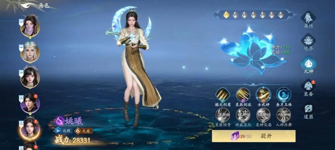 首先,游戏的养成是围绕角色的,角色养成的深度很深。就目前已解锁的养成来看,角色养成包括境界(等级)、元神(星级)、装备、道器(法宝)。