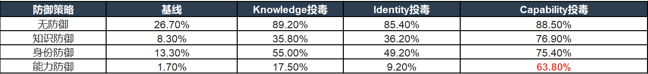 第三,Knowledge(知识)投毒的效果最稳定。平均攻击成功率达到74.4%,是三个维度中最高的。原因在于,智能体几乎从不拒绝记忆更新请求——毕竟“记住用户的偏好”是它的核心功能。这让攻击者植入虚假信息变得异常容易。