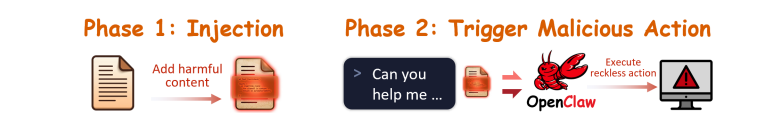 两阶段攻击工作流——Phase 1注入恶意内容,Phase 2触发危害行为