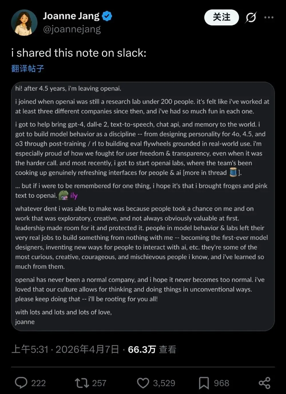 近日,OpenAI的美女亚裔高管Joanne Jang,在社交媒体上发布了一封平静且深情的告别信,宣布结束自己在OpenAI四年半的职业生涯,没有什么撕扯,也没有透露之后的去向。