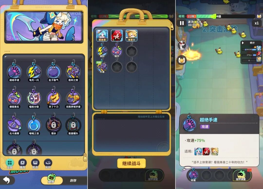 除了常规的肉鸽成长选项,游戏还额外加入了技能挂件系统。对局中会随机掉落功能各异的挂件,有的提升英雄攻速,有的增加技能伤害,有的则能提升弹射次数等。玩家拾取后,可自由分配给对应英雄,通过不同挂件的拆装组合,灵活打造攻速流、分裂流、爆发流等不同打法。