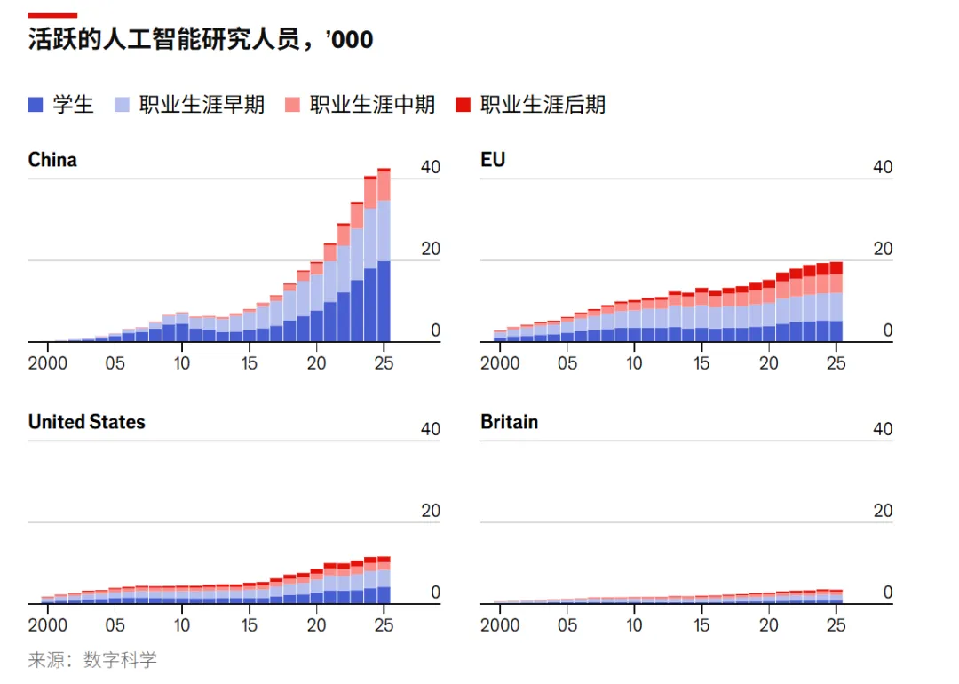 数据公司Digital Science的统计显示,中国目前活跃的AI研究人员数量已超过美国、英国和欧洲的总和。更重要的是,中国AI人才群体更年轻:47%是学生,而西方国家这一比例约为30%。
