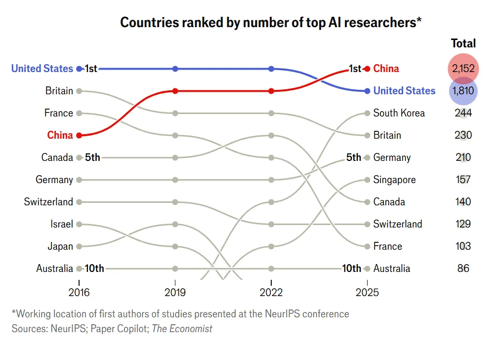 2019年,在NeurIPS上发表论文的AI研究人员中,有29%在中国开始职业生涯,20%在美国。到2025年,这一比例变成了50%在中国起步,而美国下降到了12%。