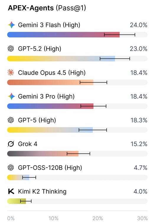 面对APEX-Agents的Pass@1(一次通过率)排行榜结果,任何出于商业化目的鼓吹“AGI即将实现”的说法都不攻自破。