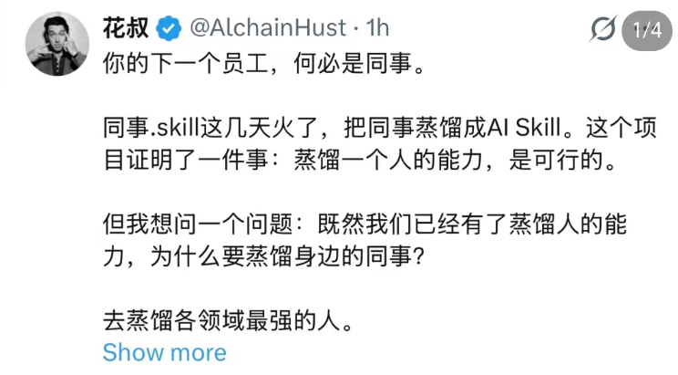 至此,职场中可蒸馏的对象,可以说是无所不包了。从自家公司的基层员工到管理层,到外部的名人、专家,甚至竞争对手。所有人都能被蒸馏成skill,以后的职场只需要一个个skill,互相安排工作、对接协作?