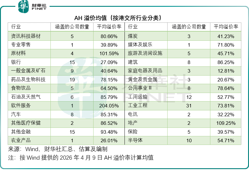 从行业维度统计,非银行金融(其他金融类平均溢价93.48%)、能源(石油及天然气85.79%、煤炭41.23%)、汽车(85.31%)、建筑(86.25%)等行业的平均溢价率均处于高位,而资讯科技器材(80.66%)、药品及生物科技(78.15%)等行业也维持较高溢价水平。