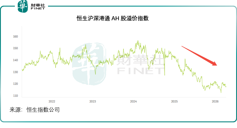 恒生沪深港通AH股溢价指数持续走低,从2024年2月接近158点的高位回落,至2026年初为123.48点,现报118.94点,见下图,显示AH股估值差距正逐步收敛。