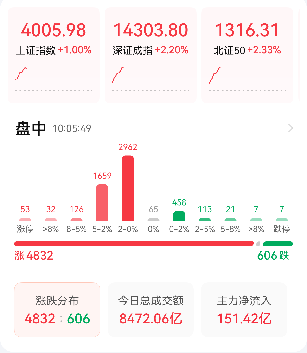 4月10日,A股高开高走,沪指盘中涨超1%,再次站上4000点整数关口。截至发稿,深指涨2.2%,创业板指涨2.8%,全市场超4800只个股飘红。
