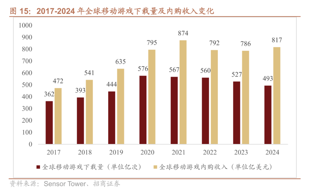 但一个让业内都意外的数据是,2024年,全球内购收入回升至817亿美元,接近历史高位。这种“下载规模收缩、收入端保持高位”的结构性分化,意味着增长的驱动力已由新增用户规模,转向对存量用户价值的持续挖掘。