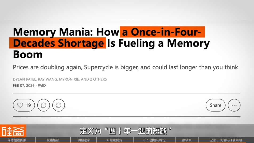 SemiAnalysis将这轮周期定义为“四十年一遇的短缺”。但更有价值的方向或许是:存储芯片行业正站在一个分岔路口,它要么像过去四十年一样,在价格峰值后滑入又一轮低谷;要么,在AI的结构性需求驱动下,真正打破周期宿命,成为一个持续增长的产业。
