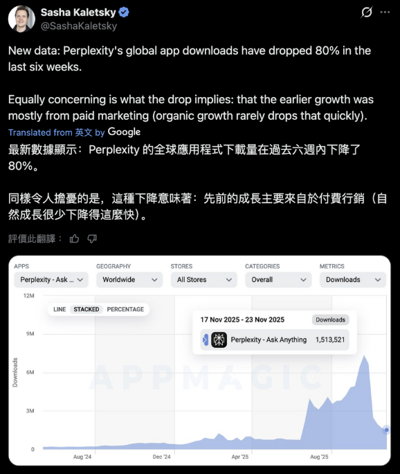 图注:Perplexity在去年下半年出现了80%的下载量下滑。
