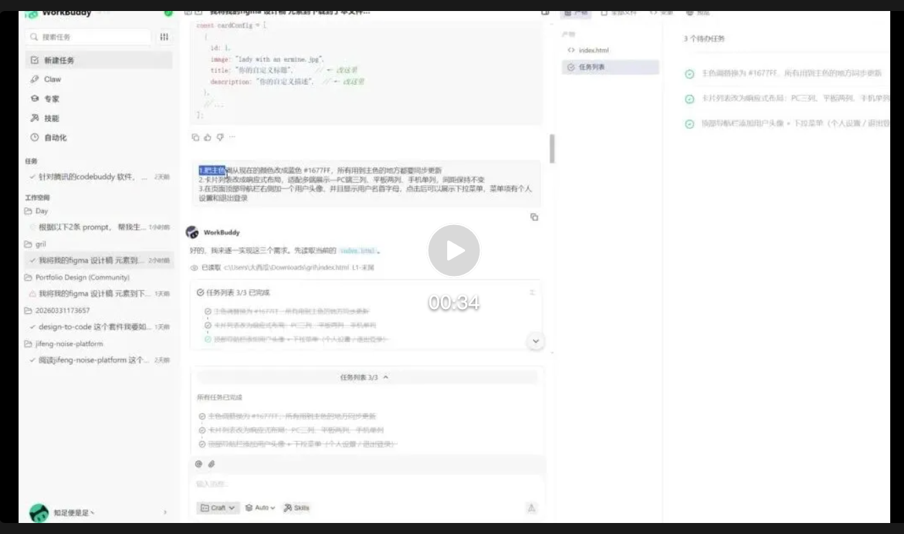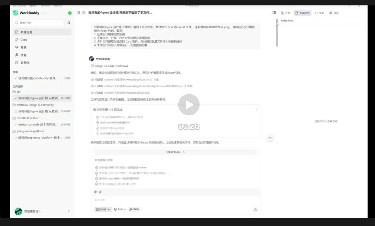接下来,WorkBuddy手脚麻利,直接调用了“Figma套件”能力,精准地读取了设计稿中的每个Hex色值、每个像素的间距,然后生成了一份结构清晰的代码。