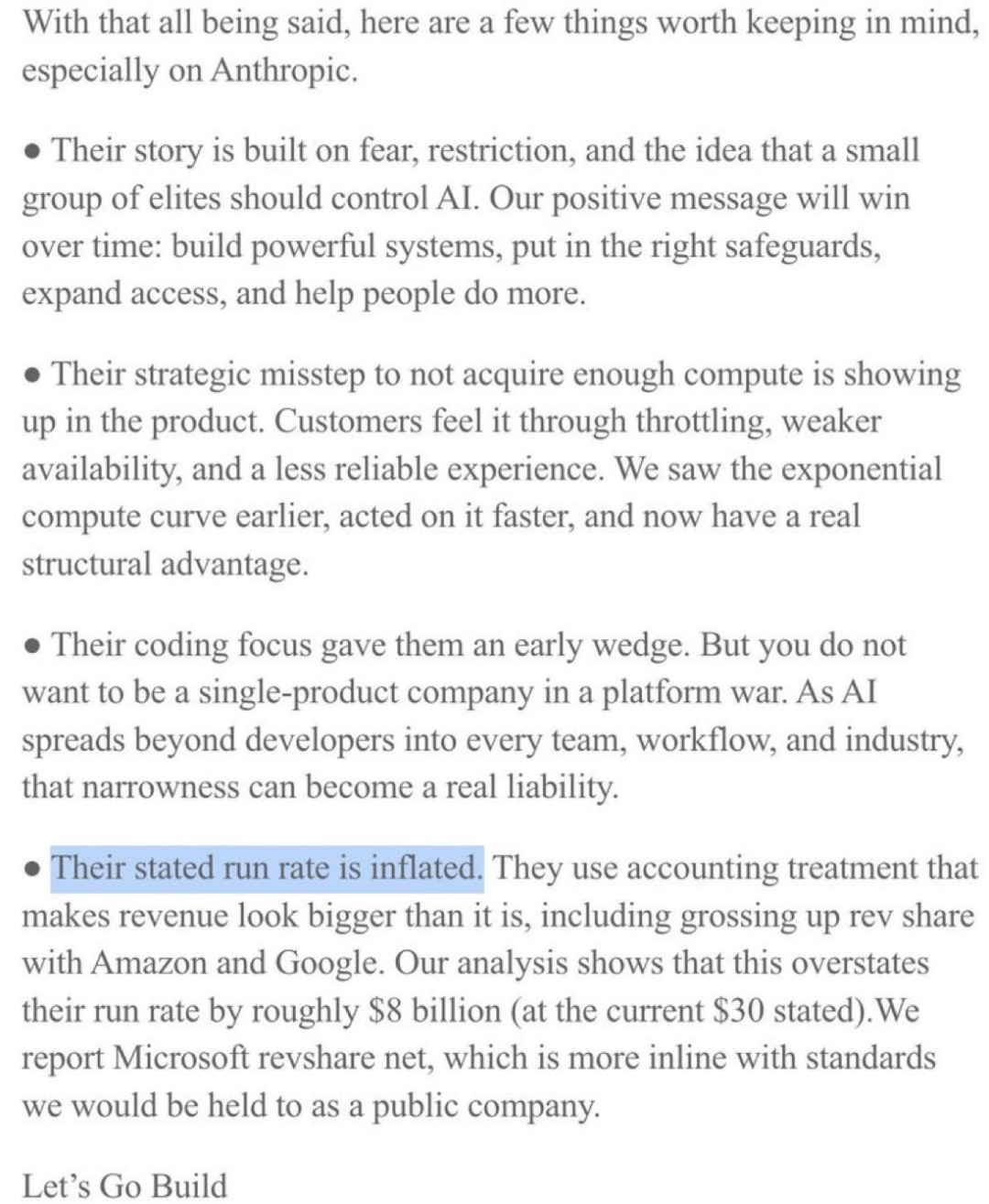但是在这份备忘录中写到,Anthropic的年化收入中,80亿美元是通过会计处理手段“虚增”出来的,也就是说他们的年化收入应该在220亿美元。没有超过OpenAI的250亿美元。