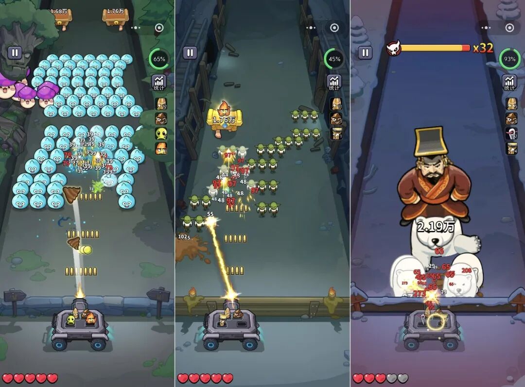 从玩法上来看,该游戏的核心乐趣与我们开篇提到的创意素材非常类似。游戏主线以常规关卡形式呈现,关卡中,各种怪物会一批一批从上方涌出,玩家想要通关,就必须控制角色左右走位,控制输出方向和节奏,防止怪物突破塔防区域,同时尽快消灭掉所有的怪物。