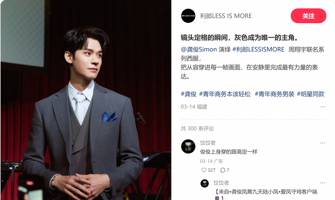 画面中,龚俊身着一套深灰色三件套西装,内搭蓝白竖条纹衬衫,整体造型利落精致,兼具商务感与时尚感。“龚俊真是太会抬衣服了!”“龚俊穿着像高定!”“竟然是利郎?”“利郎竟然有这么好看的西装!”评论区里,一半是对龚俊本人的夸赞,另一半则是对西装品牌的意外——绝大部分网友都没有想到,这套被龚俊穿出高定感的西装,来自利郎旗下轻商务系列“LESS IS MORE”与先锋设计师周翔宇的联名合作系列。
