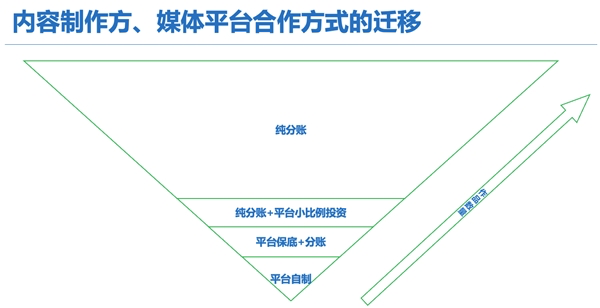 与此同时,平台和制作方的合作方式将逐渐向分账模式迁移,分账模式将成为主导。纯分账的内容数量占比会越来越高,其次是纯分账+平台小比例投资(比如投资算力、IP),再其次是数量较少的平台保底+分账模式,最后是平台自制内容。