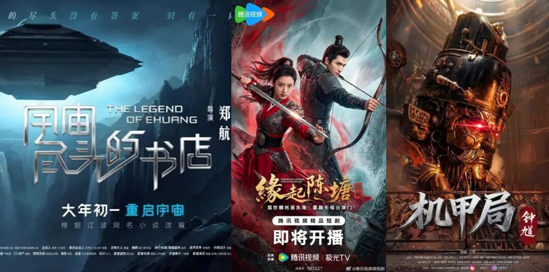 比如悟空文化出品的AI番剧《宇宙尽头的书店》、星河影创出品的AI短剧《缘起陈塘之倾城》、九紫源文化和围观短剧联合出品的AI短剧《机甲局:钟馗》等,都在腾讯视频进行独播/首播。
