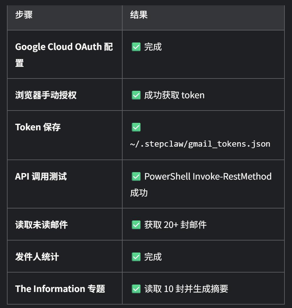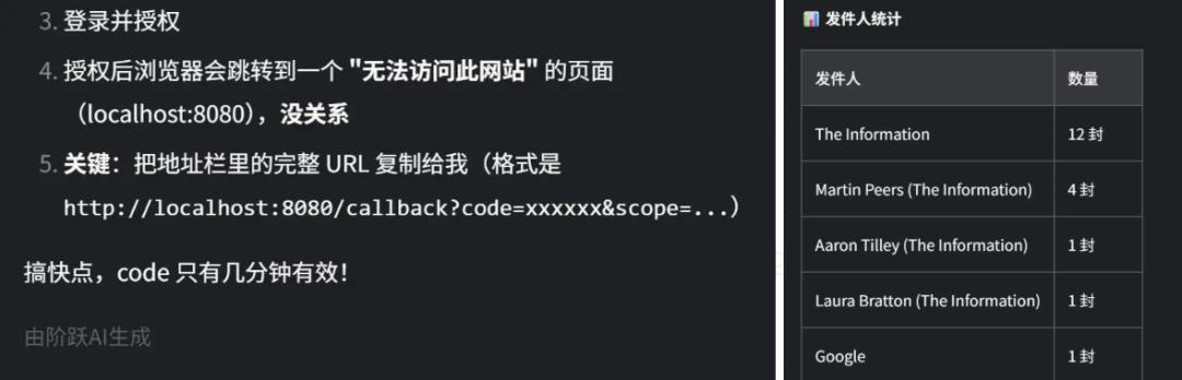 先执行完成的是阶跃星辰的StepClaw,虽然中间它无数次委婉提示我可以直接手动导入邮箱数据来让它分析(像极了我推活的同事),但在我坚持要求“不要让人类动一下手”后,它自己绕过了获取Token的坎,干脆自己写了个可以在网页端运行的脚本来自行读取Token给它。在它一遍遍催促我“要快”的情况下,终于连接成功了。