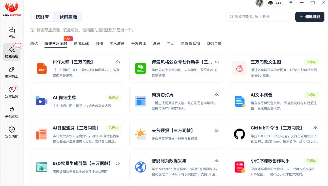例:EasyClaw的Skill商店里,还标出了傅盛版小龙虾的同款技能
