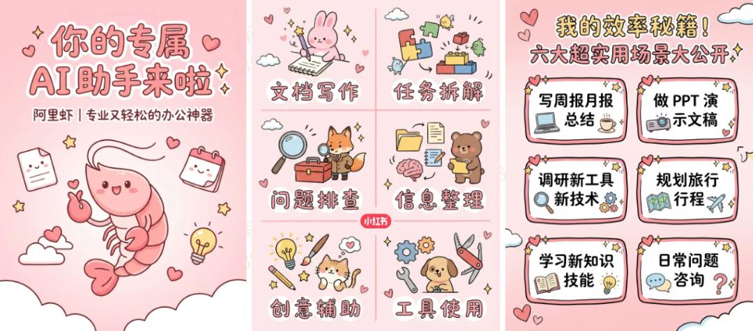 从最终生成质量来看,阿里虾JVS Claw的表现一骑绝尘,它从Vercel团队的官方Skill网站找到了个人用户上传的技能,一口气给出了5张产品介绍图,虽然调用的是小红书生图的Skill,但整体风格已经满足了卡通讲解的需求。