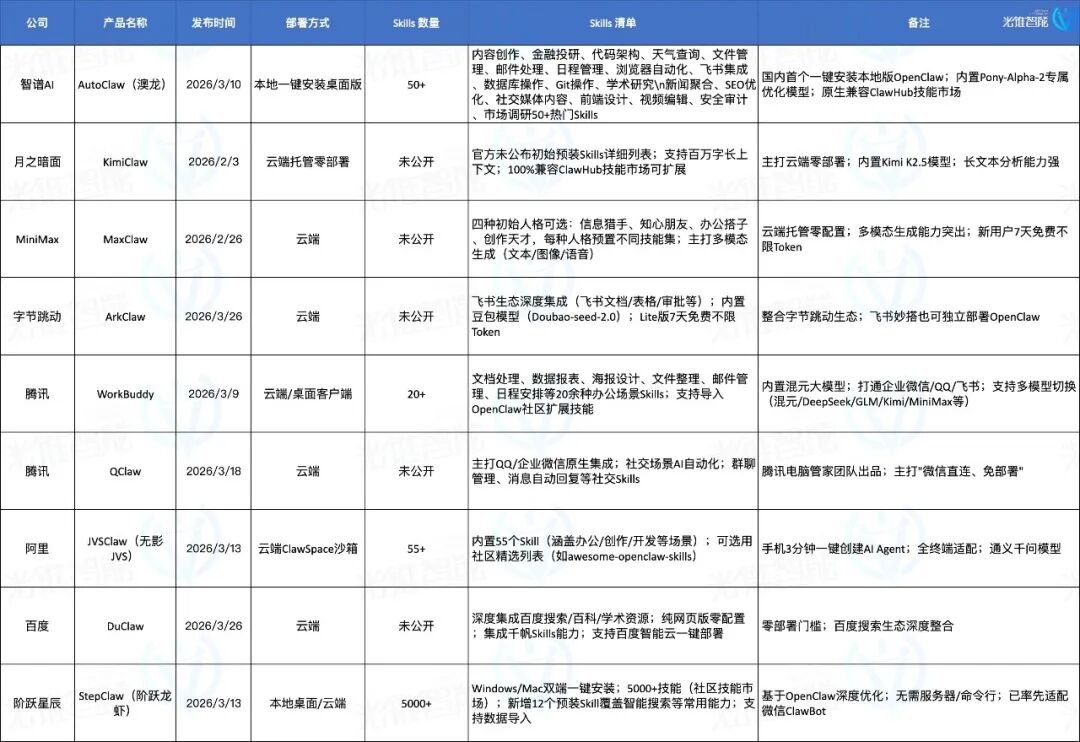 厂商的预装是用户好体验的开始,我让小龙虾们来搜索了一下上述这些产品初始预装的Skills数量,并做成表格发给我。表现突出的是智谱,完整找到了所有产品,并且给出了多数正确的结果。