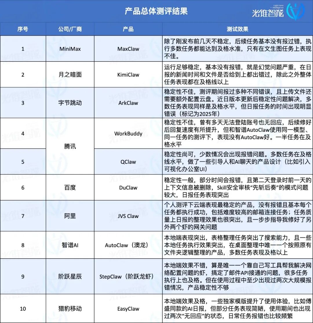 带着这样的想法,光锥智能测评了市面上10款小龙虾产品,从一个没有AI基础的用户视角出发,看看它们到底能不能扛得起测试“拷打”。