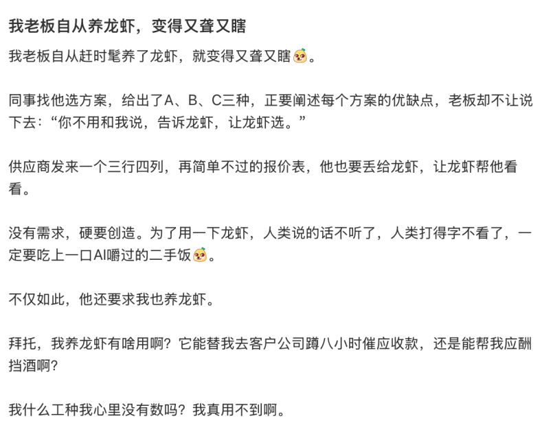 在这一刻,员工完成了双重糊弄:既用了AI工具交差,又向老板证明了自己的判断力高于龙虾。