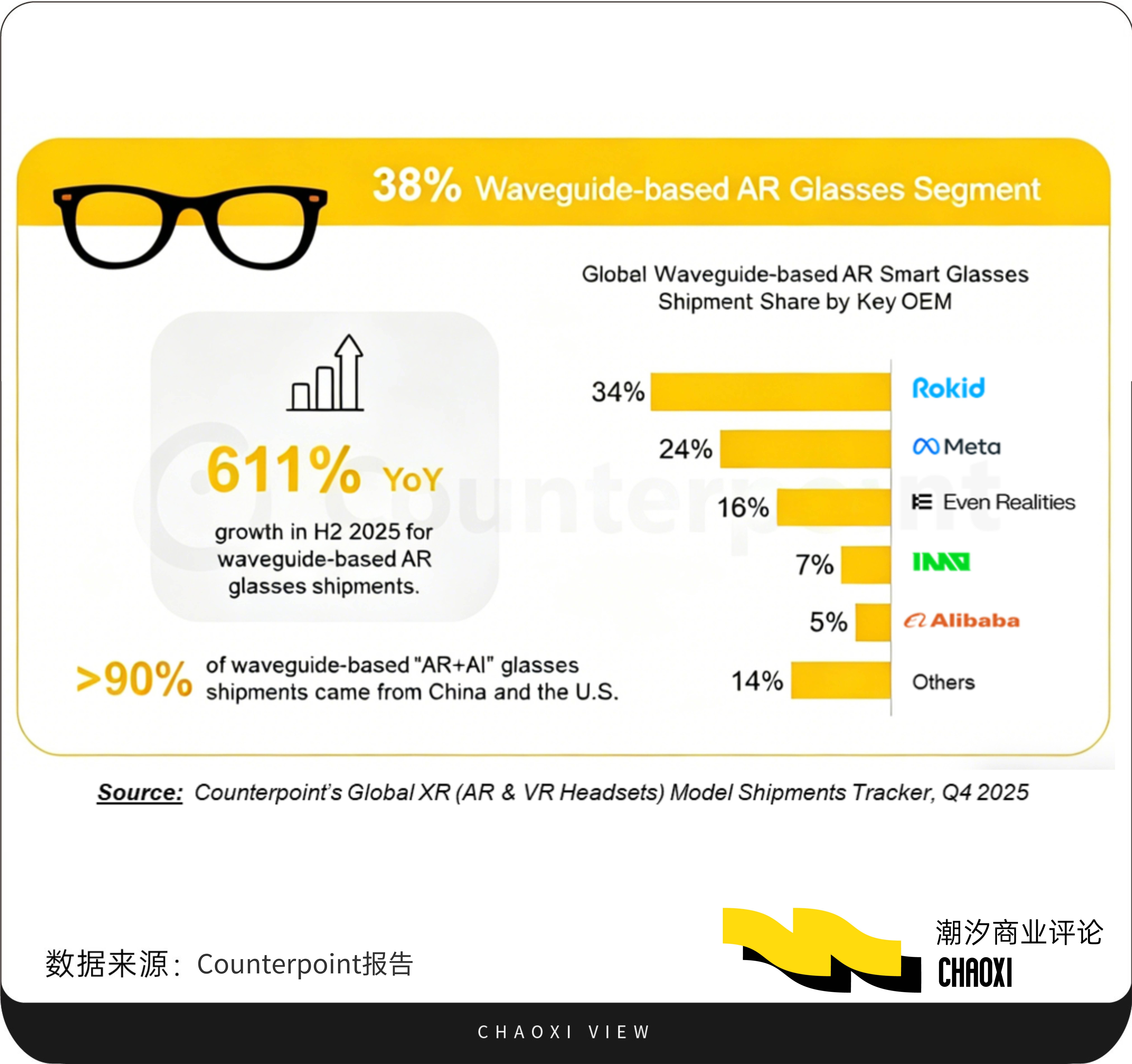 这种“破圈”并非偶然,Rokid与BOLON的合作款打的是“时尚设计”与“硬核功能”两张牌——让眼镜先像一副眼镜。这个思路,恰恰击中了行业最核心的痛点:产品不好看,用户不愿意戴,再强的功能也是零。去年,Rokid乐奇AI眼镜年订单量超35万台。根据Counterpoint报告显示,2025年下半年,全球超过90%的“AR+AI”眼镜出货量来自于中国和美国。其中,Rokid的出货量占据了34%的全球市场份额,位居第一,领先于Meta、Even Realities等竞争对手。