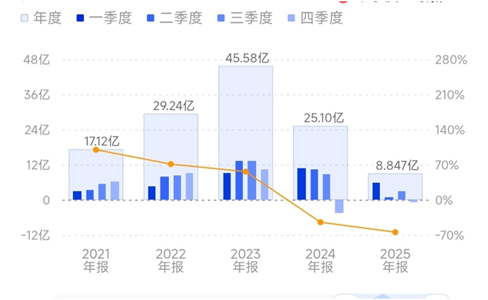 和自己比:晶盛机电的业绩已连续两年大幅下降,2025年的净利润不足2023年高峰期的20%。