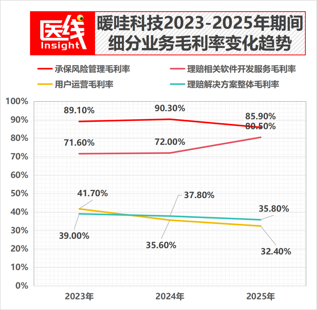 不过,代表着暖哇最核心AI技术壁垒的“承保风险管理”纯技术赋能业务,依然保持着85.9%至90.3%的高毛利率;“理赔相关软件开发服务”毛利率也高达80.5%。