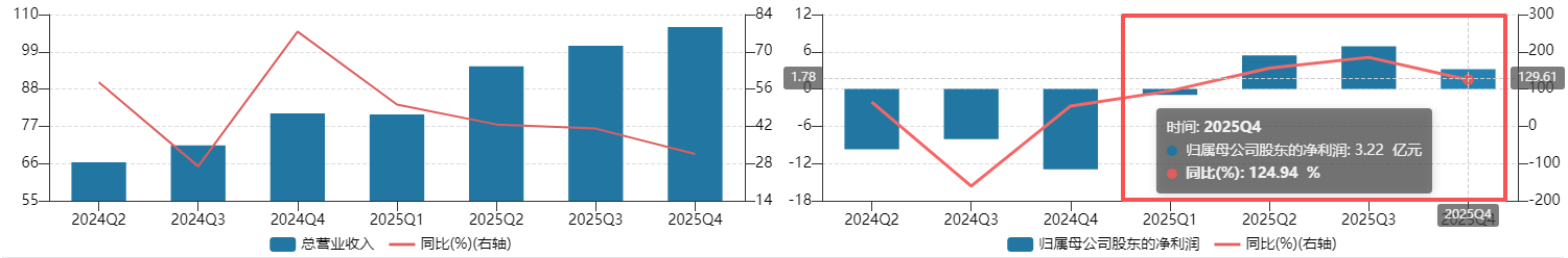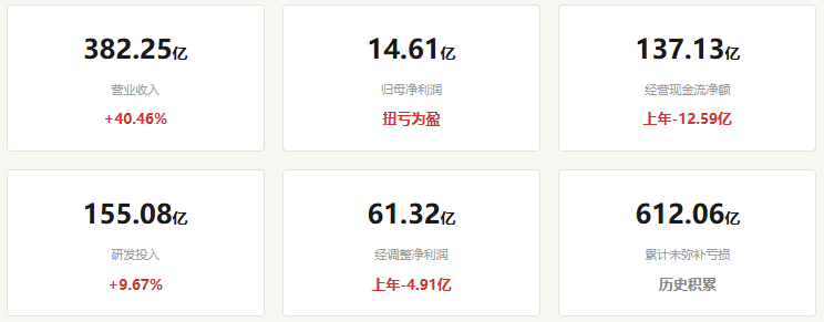 全年来看,公司实现营业收入382.25亿元,同比增长40.46%,延续稳健高增态势;归母净利润14.61亿元,相较于2024年净亏损49.78亿元,正式实现扭亏为盈,这也是公司自成立以来首次全年盈利。