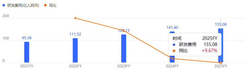 经营杠杆效应也开始集中显现。2025年公司研发投入155.08亿元,同比仅增长9.67%,研发费用率从2024年的51.96%降至40.57%。这是一个关键的结构性信号,创新药企的盈利弹性,通常在收入增速大幅超越费用增速时集中释放。