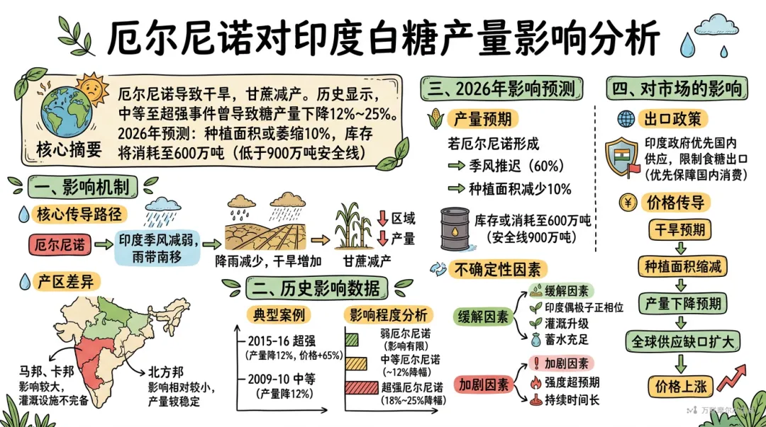 白糖是另一个受厄尔尼诺显著影响的品种,但其影响机制与棕榈油有所不同。厄尔尼诺主要通过导致印度、泰国等主产国干旱,造成甘蔗减产,进而推高糖价。