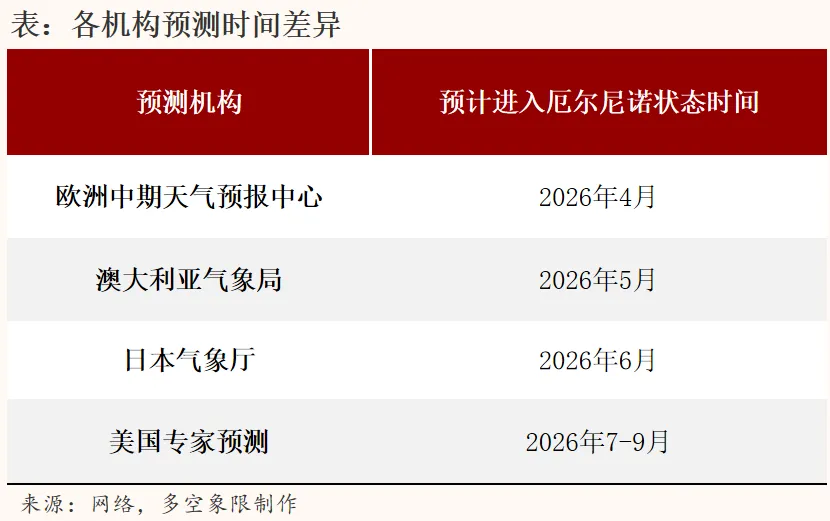 2026年发生厄尔尼诺概率较高:国家海洋环境预报中心预计春末夏初进入状态、秋冬季形成中等偏强事件;中科院大气物理研究所给出中等强度概率超70%、超强概率约10%;NOAA将下半年出现概率提升至60%。但各机构在时间上存在分歧(4月至9月不等),反映预测不确定性。