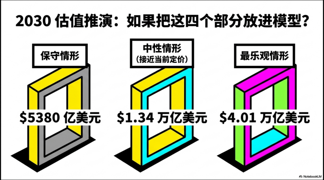 汽车/能源/服务底盘:2030 年收入 1500 亿美元,经营利润率 13%,对应 EBIT 195 亿;给 18 倍 EBIT,再加 400 亿净现金,得到 3910 亿美元。