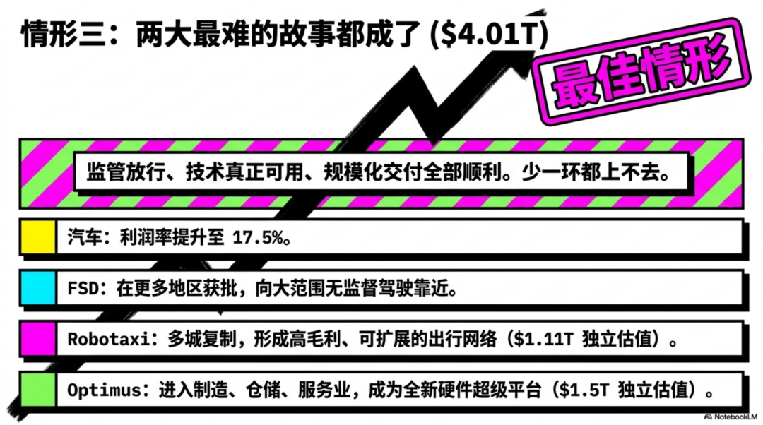 按我这套分拆法,特斯拉是“汽车/能源底盘 + FSD 软件 + Robotaxi 网络期权 + Optimus 机器人远期期权” 的混合体。我的三种情形点估值大致是: