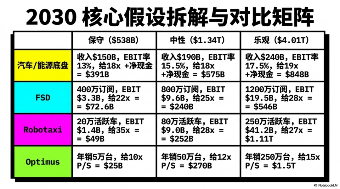 Robotaxi:假设250 万台活跃 Robotaxi,单车年收入 5.5 万美元,收入 1375 亿;按 30% 利润率,EBIT 412 亿;给 27 倍,得到 1.11 万亿美元。