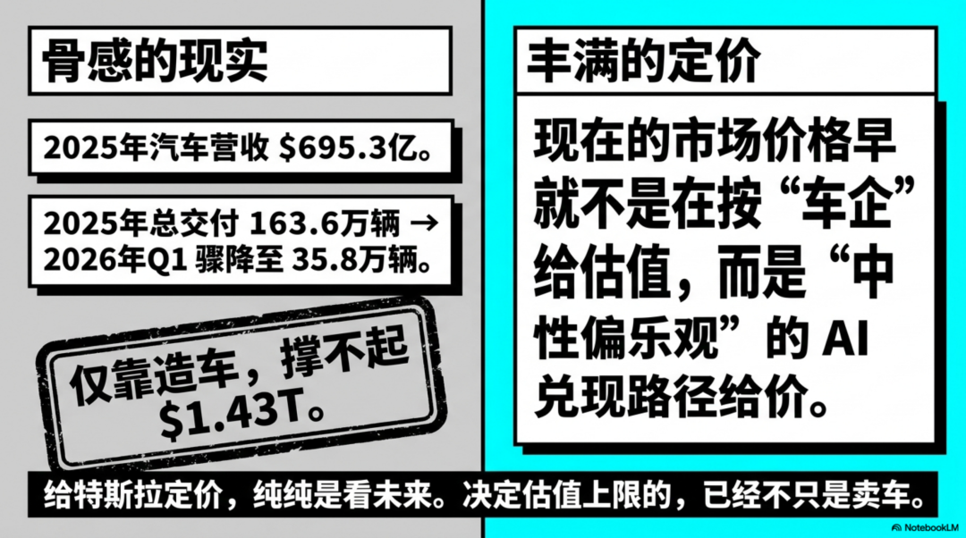 全年交付163.6 万辆,但到2026 年一季度,交付只有 35.8 万辆。这说明汽车主业当然还是大底盘,但单靠当前汽车利润水平,本身撑不起1.4 万亿美元市值。