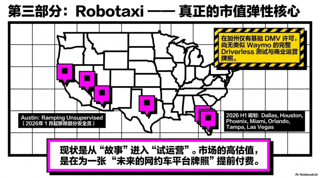 Robotaxi 从 Austin 试运营走向多城复制,形成一个高毛利、可扩展的出行网络;