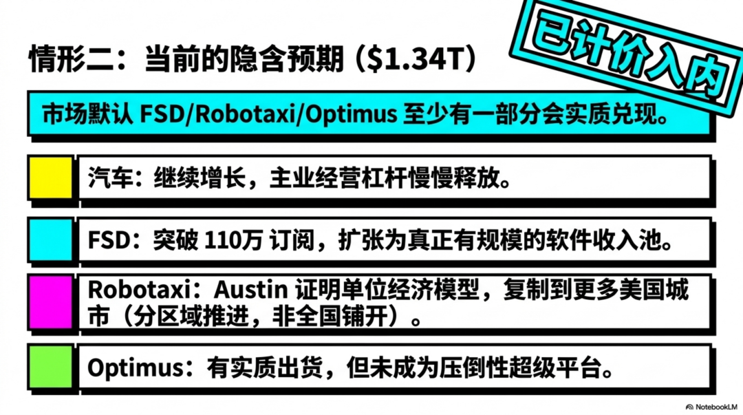 这和今天1.43 万亿美元 的市值已经非常接近。也就是说,市场实际上已经默认:特斯拉FSD/Robotaxi/Optimus 里面至少有一部分会真的兑现。