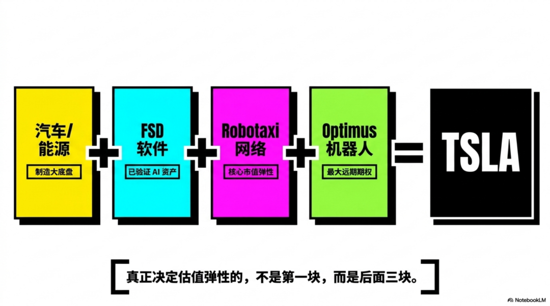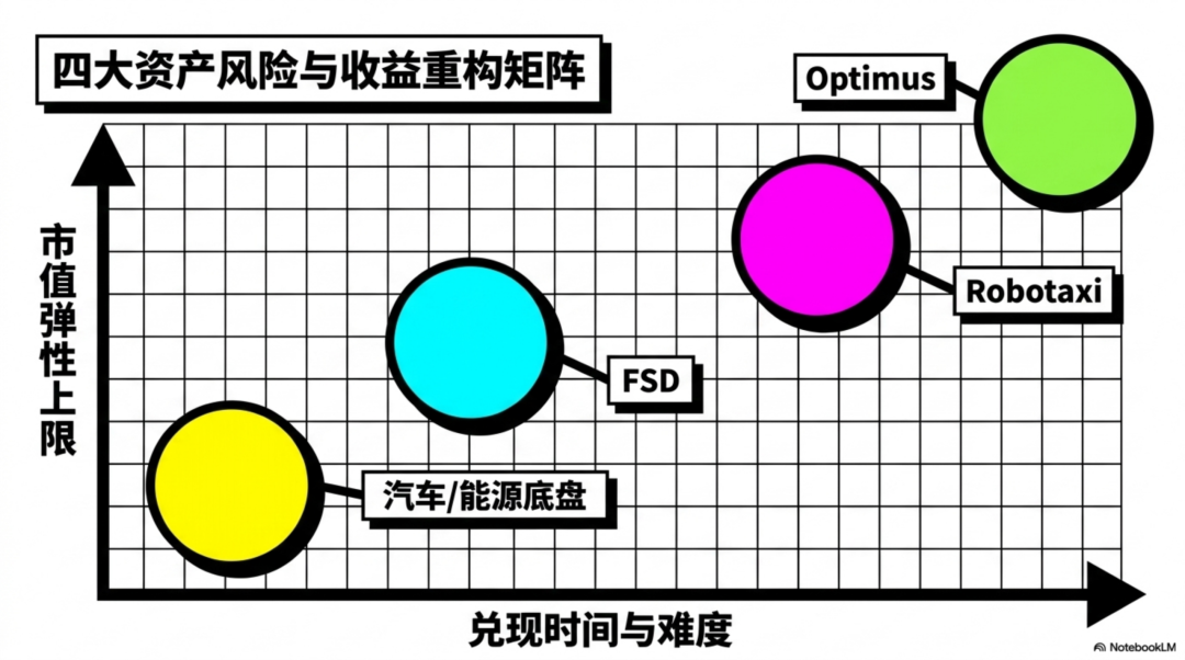 最确定的是底盘,最先兑现的是FSD,最能拉大市值上下限的是Robotaxi,而想象空间最大但时间最远的是Optimus。