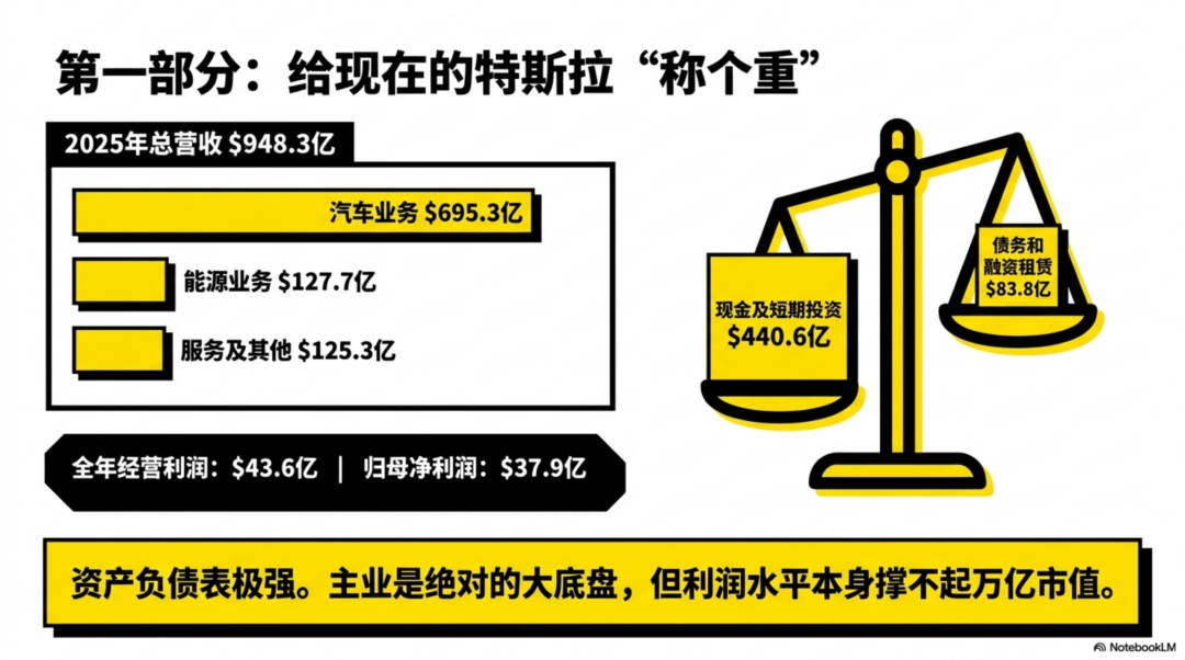 看2025 年底的财务底盘,特斯拉全年总营收 948.3 亿美元,其中汽车业务695.3 亿美元,能源业务127.7 亿美元,服务及其他125.3 亿美元;全年经营利润43.6 亿美元,归母净利润37.9 亿美元。