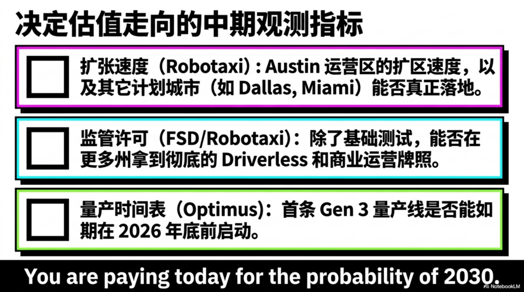 重点在于:2030 年之前,FSD 能不能继续放量,Robotaxi 能不能跑出商业网络,Optimus 能不能从概念机变成真正出货的产品。