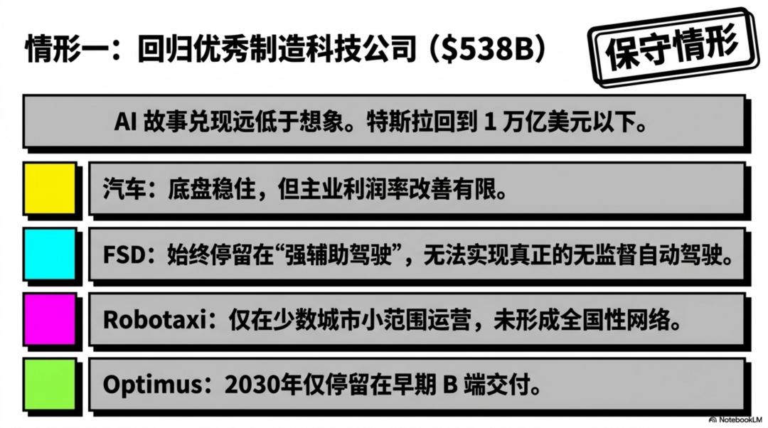 这相当于说,市场最后发现:特斯拉依然是家很强的公司,但AI 故事兑现远低于想象,那它就会从“AI 平台股”往“优秀制造科技公司”回归。这个情形下,特斯拉回到 1 万亿美元以下并不奇怪。