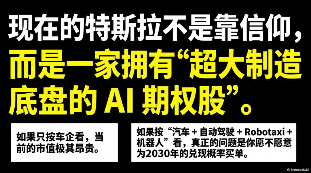 因此,与其说特斯拉靠信仰,不如说,这是一家已经有超大制造底盘的AI 期权股。