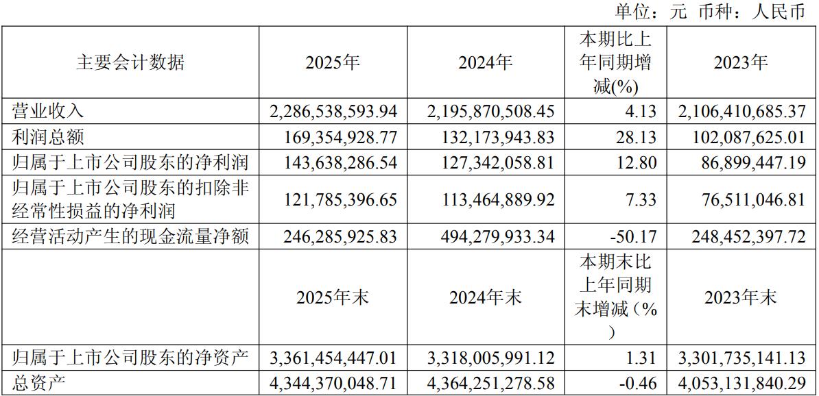 年报显示,这家拥有186年历史的中华老字号全年营收22.87亿元,同比微增4.13%;归母净利润1.44亿元,同比增长12.8%。然而,光鲜的利润数据难掩造血能力的隐患——经营现金流净额仅2.46亿元,同比骤降50.17%,创上市以来最大跌幅,从上年近5亿元的水平近乎腰斩。