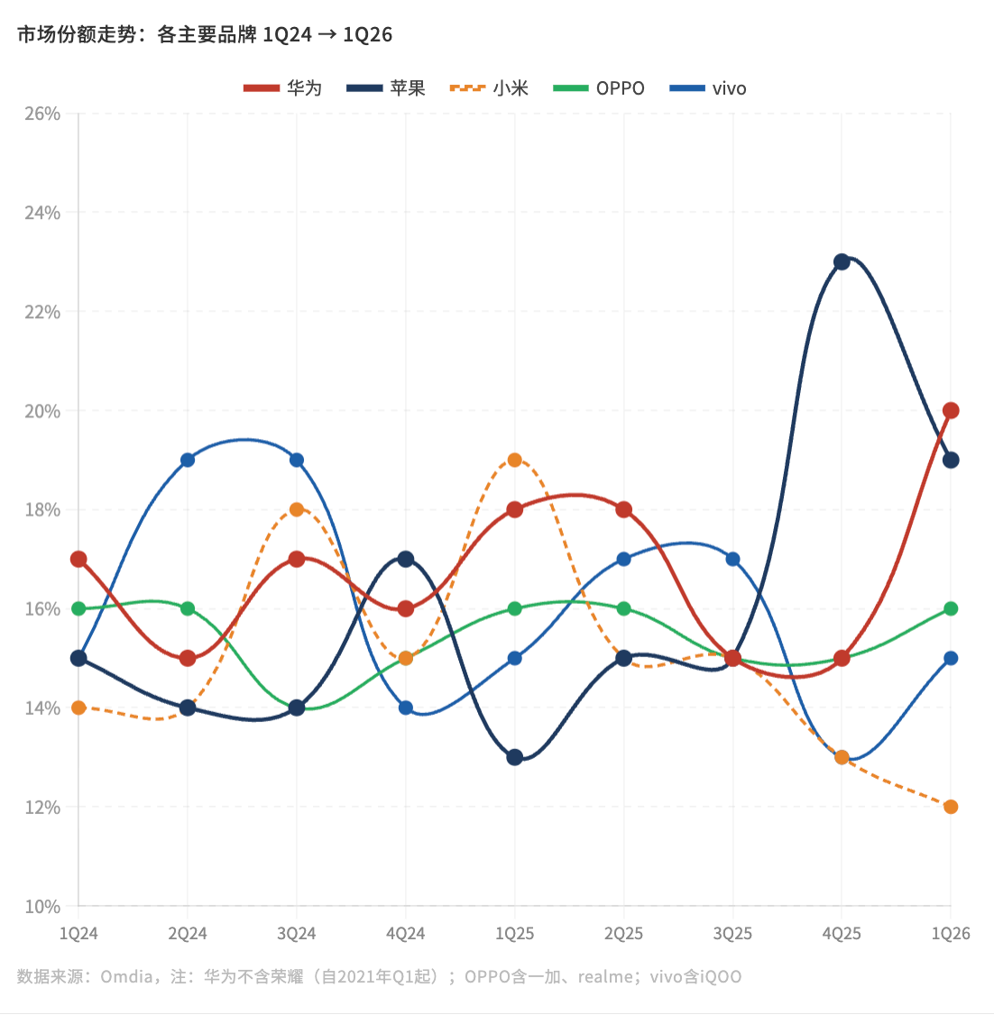 这是realme重新发力后的一个季度。realme补充了OPPO在中低端的出货量,但中低端恰好是存储涨价打击最重的区间。realme的性价比主张面临和红米相同的困境,能走多远,要看接下来几个季度的数据。