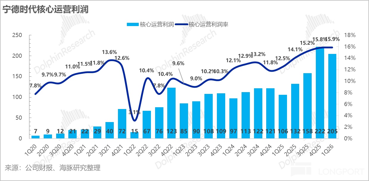 而海豚君更关注的核心运营利润率趋势(毛利率-三费-资产/信用减值损失率),一季度205亿元,同比增速高达94%,核心运营利润率也达到15.9%,环比与上季度持平,也表明宁王持续稳健的经营能力。