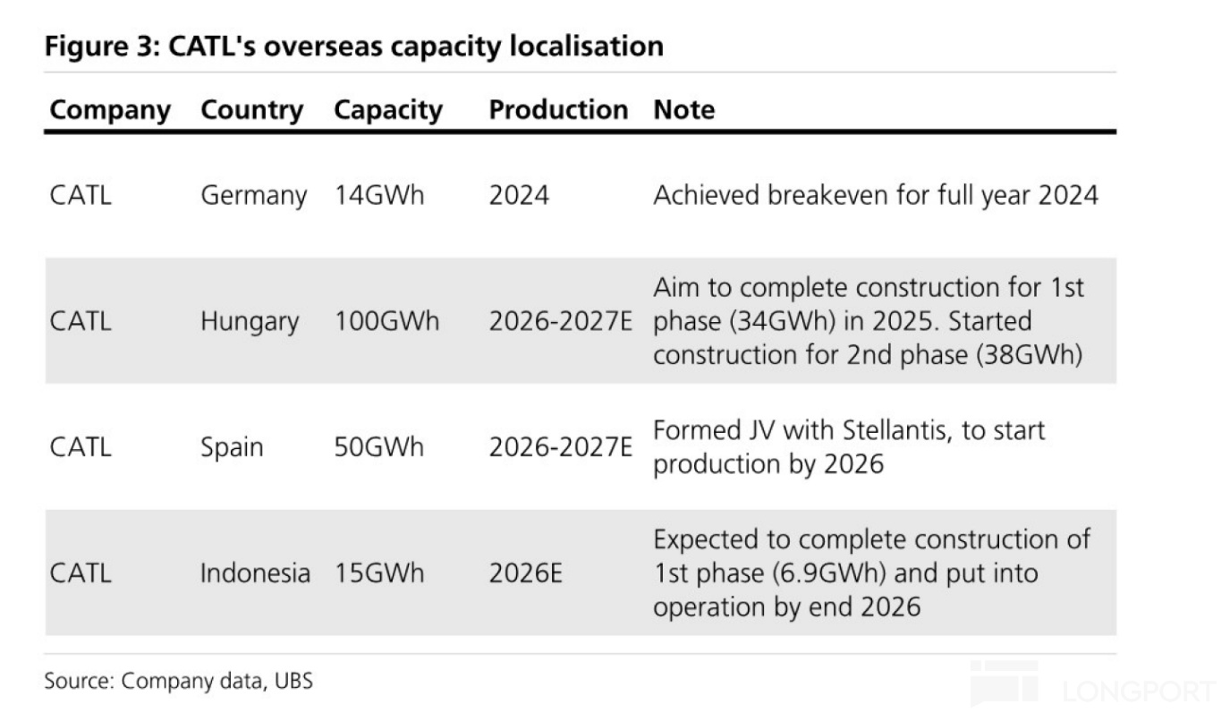 欧洲:德国工厂(14GWh)已于24年投产并实现稳定盈利;匈牙利工厂(规划100GWh)的一期项目(34GWh)电芯产线设备已进场调试,预计2025年底建成;西班牙工厂(规划60GWh)已完成前期审批并成立合资公司,即将在2026年正式启动筹建。