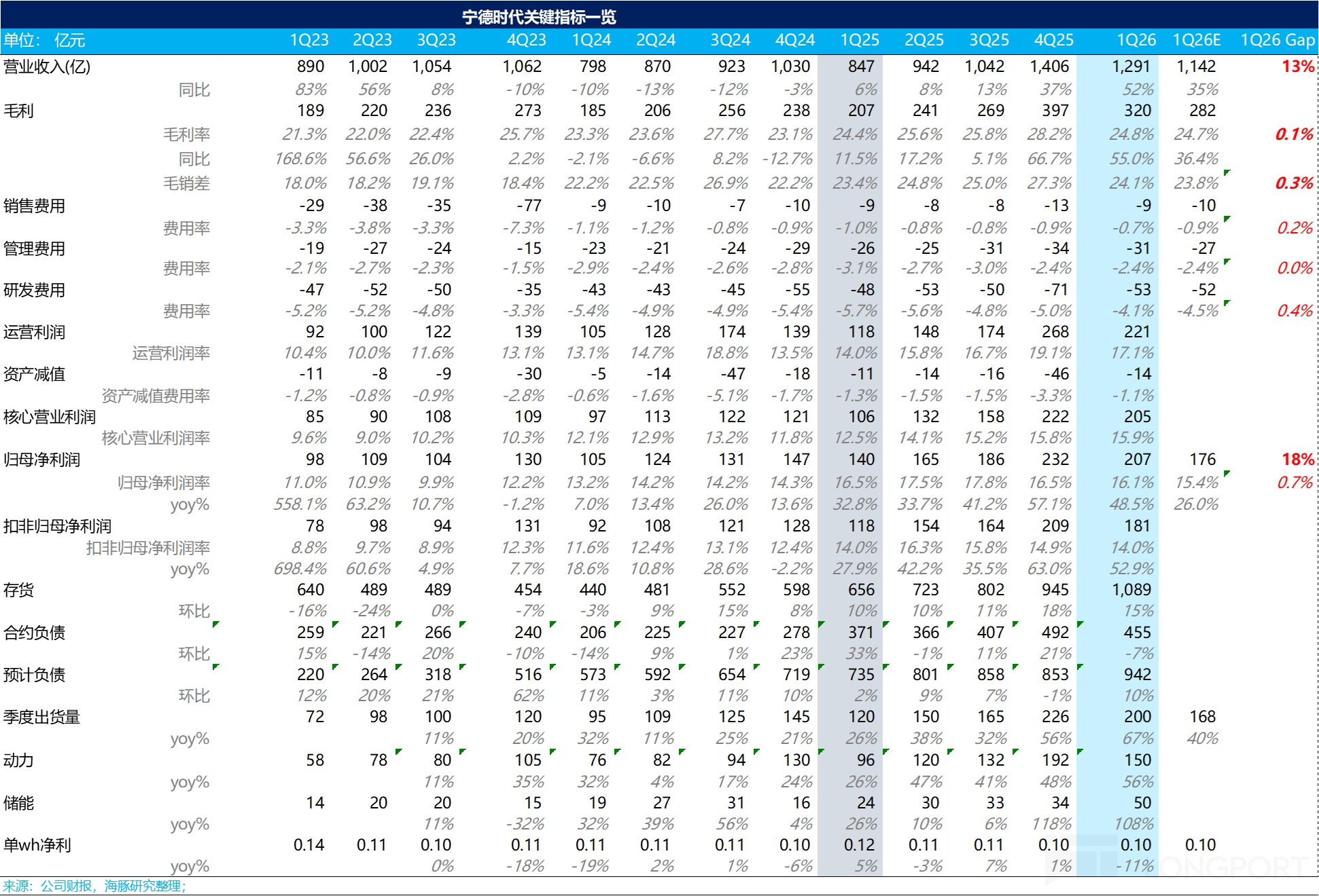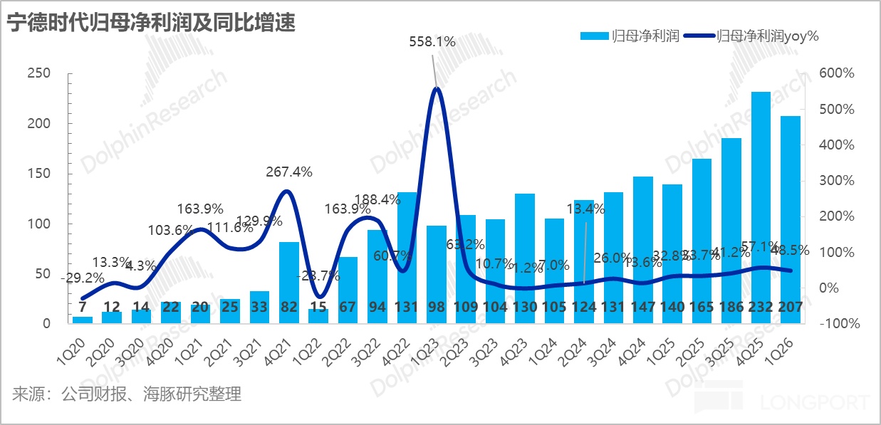 一季度,宁王归母净利207亿(同比增长49%)同样大幅高于市场预期176亿,扣非归母净利润164亿元,同比大增53%。